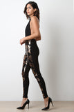 This sexy jumpsuit features a stretchy fabrication, a halter neckline with a plunging front, sleeveless construction, an open back design, and taper cut legs with sequins designs. Accessory sold separately. Made in U.S.A. 95% Polyester, 5% Spandex.