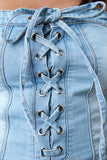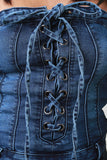 This jumpsuit features a strapless tube neckline, corset lace-up front, princess seam stitching, belt loops, 4-pockets, taper cut legs with distress accent, and side zipper fastener. Accessory sold separately. 97% Cotton, 3% Spandex.