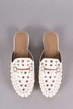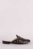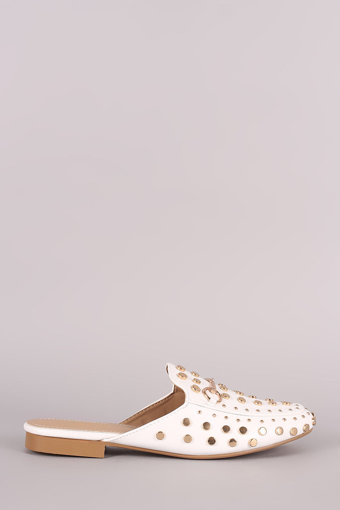 This edgy mule flat features a rounded toe, multi-size studs accent, gold-tone metal horsebit ornament embellishment at front vamp, lightly cushioned insole, and slight heel. Easy slip on style.