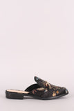 This stylish mule flat features a satin upper with oriental inspired embroidery design, round toe silhouette, and metal horsebit ornament embellishment. Finished with an exposed back, lightly cushioned insole, and low block heel. Easy slip on style.