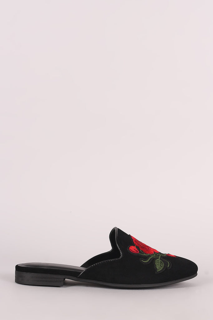 This mule flat features a soft vegan suede upper with an embroidery rosette patch detail, open back design, almond toe silhouette, and lightly padded insole.