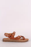 This flat sandal features an open toe silhouette with a toe loop strap, asymmetrical construction with a triple buckled design and a slingback adjustable ankle strap.