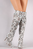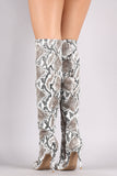 These fashionable boots feature a python print vegan leather, pointy toe silhouette, and wrapped stiletto heel. Finished with a side zip-up closure, lightly cushioned insole, and fabric lining.