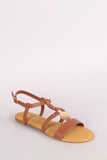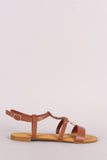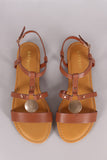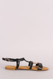 This cute flat sandal features an open toe silhouette, a strappy caged construction with stud accents, metal plate hardware, adjustable ankle strap with buckle fastening, and lightly padded insole.