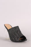 This alluring heel features a peep toe silhouette, glitter patterned design upper, and clear cylindrical-heel. Finished with a lightly padded insole and easy slide style.