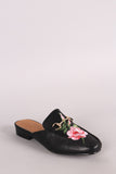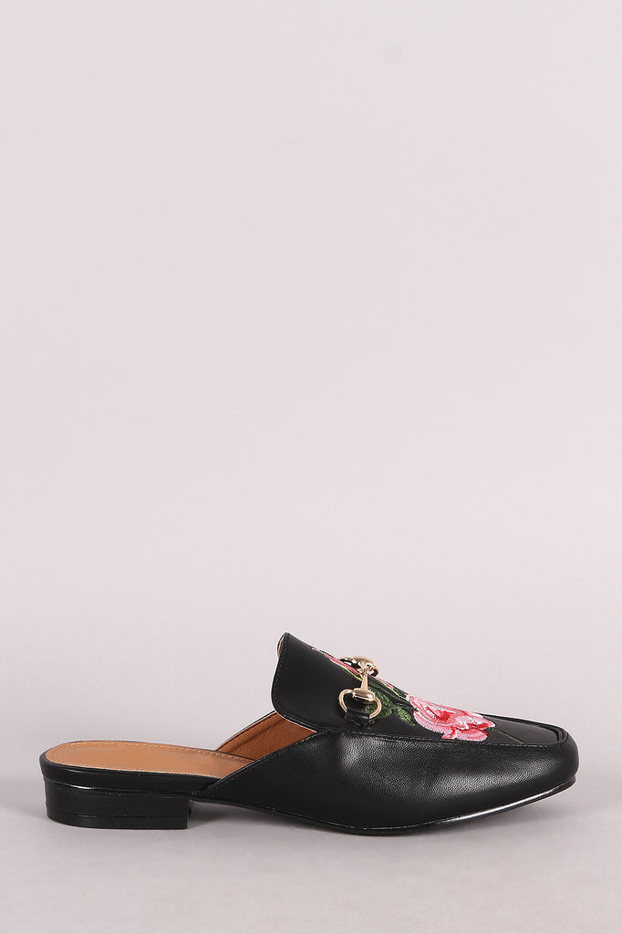 This mule flat features an embroidered floral design, closed toe silhouette, and metal horsebit ornament embellishment. Finished with an exposed back, lightly cushioned insole, and low block heel. Easy slip on style.