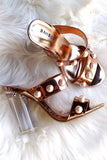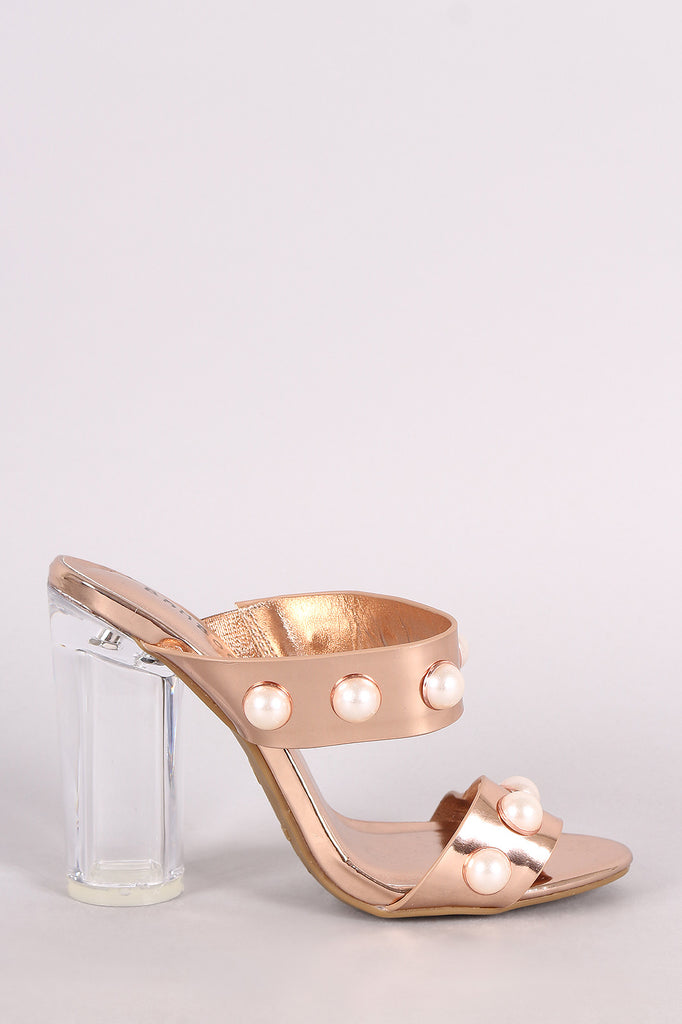These stunning heels feature an open toe silhouette, double vamp straps with faux pearl accents, and cylindrical clear heel. Finished with a lightly padded insole and easy slide style.