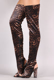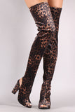 These fashionable leopard boots feature a peep toe silhouette, slightly stretchy velvet shaft, open heel counter, and lightly cushioned insole. Finished with a wrapped chunky heel and partial side zip closure.