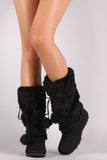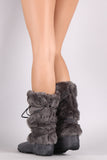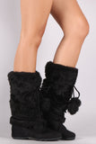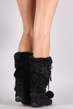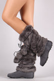 These stylish mid calf boots feature a round toe silhouette, long faux fur shaft design, strappy self-tie pom pom design, a lightly cushioned insole, smooth lining, and pull-on construction.