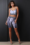 These legging shorts features a jersey knit fabrication, tie dye print, contrast ribbed knit trim with stripe detailing, and an elasticized high waist cut. Accessory sold separately. Made in U.S.A. 95% Rayon, 5% Spandex.