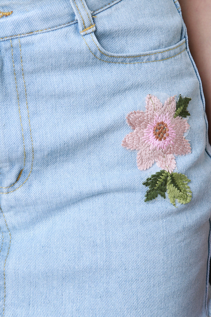 This lovely denim skirt features floral embroidery detail, mini-length hem with a raw cut, classic 5-pockets, belt loops, zipper fly, and a single button closure. Accessory sold separately. 100% Cotton.