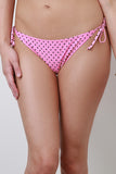 These bikini bottoms feature white polka dots throughout, self-tie side straps with knotted ends, and small ruffle down back. Fully lined. 80% Nylon, 20% Spandex. 100% Polyester Lining.
