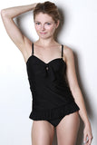 This two-piece tankini features adjustable spaghetti straps, gold-tone hardware, sweetheart neckline, small center keyhole with self tie sash for cinched design, removable cup padding, strategically place seam under bustier, wide ruffle hemline and separated bikini brief. 80% Nylon, 20% Spandex.