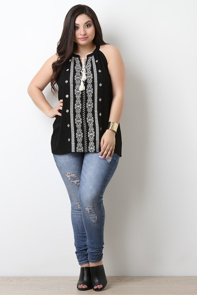 This chic plus size top features a textured knit fabrication, embroidery design, round neckline with self-tie tassel design, and sleeveless construction. Accessories sold separately. 100% Rayon.