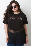 This plus size top features a jersey knit fabrication with contrast mesh bottom half, "Girl Power" print, short sleeves, round neckline and a relaxed silhouette. Accessories sold separately. Made in U.S.A. Self: 95% Polyester, 5% Spandex. Contrast: 95% Cotton, 5% Spandex.