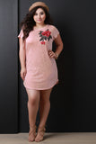 This casual plus size dress features jersey knit fabrication, distressed accents, floral applique accent, round neckline, short sleeves, and a mini length hemline. Accessories sold separately. Made in U.S.A. 50% Cotton, 50% Rayon.