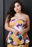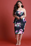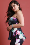 This plus size top features textured stretchy fabrication, floral pattern, strapless neckline, and a peplum hem. Accessories sold separately. Made in US..A. 95% Polyester, 5% Spandex.