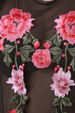 This top features embroidered floral design on semi-sheer mesh fabrication, round neckline, sleeveless, maxi length hem, and m-slit front. Accessory sold separately. Made in U.S.A. 95% Nylon, 5% Spandex.