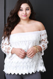 This plus size top features an elasticized off-the-shoulder neckline, crochet lace fabrication, long sleeves, and scallop hemline. Partially lined. Accessories sold separately. 100% Polyester.