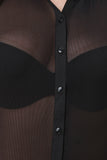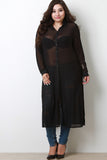 This plus size top features a semi-sheer mesh fabrication, button-up front, collar neckline, long sleeves, vent slits at sides and center front, finished with a maxi length hemline. Accessory sold separately. 93% Nylon, 7% Elastane.