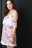 This stylish mini dress features and off the shoulder elastic neckline. ruffle layer woven fabrication, all over floral print, with a a loose shift dress silhouette. Accessories sold separately. Made in U.S.A. 100% Polyester.