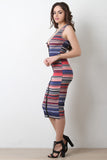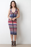 This dress features a stretchy fabrication, colorful stripe design, v-neckline, sleeveless construction, two working snap buttons, decorative buttons down the front, and finished with a midi-length hemline. Accessory sold separately. Made in U.S.A. 95% Polyester, 5% Spandex.