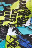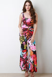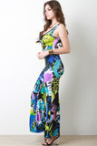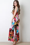 This jumpsuit features a stretchy fabrication with colorful graphic designs, square neckline, open back design with a v boning, sleeveless cut, high waisted seam, and wide leg pants. Accessories sold separately. Made in U.S.A. 92% Polyester, 8% Spandex.
