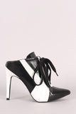 These sporty yet sophisticated heels feature a pointy toe silhouette, contrast patch detail with top stitching accents, and lace-up closure. Finished with a lightly padded insole and easy slide style.