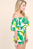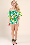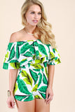 This romper is bardot elasticized neckline, featuring two ruffles. Crepe texture with tropical leaves print throughout, pattern placement may vary. Accessories sold separately. 96% Polyester. 4% Spandex. Made in USA.