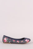This lovely ballet flat features a rounded toe, floral print denim with contrast trim at topline, lightly padded insole, and easy slip on style.