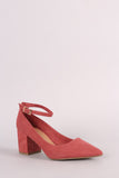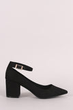 Bamboo Suede Pointy Toe Ankle Strap Block Heeled Pump