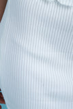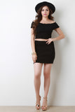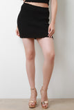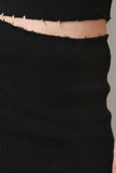 This skirt features ribbed knit fabrication, high-rise waist, raw cut edges, and a mini-length hemline. Accessory sold separately. 100% Polyester.