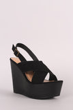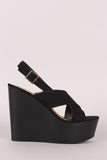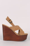 This wedge , features two wide crossing straps, open toe, and an adjustable back strap. Elevated on a platform. Faux wood design.