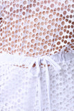 This jumpsuit features a semi-sheer diamond fishnet construction, boat neckline, three-quarter length sleeves, elasticized waist with a self-tie design, and cuffed hem. Underlay and accessories sold separately. Made in U.S.A. 100% Polyester.