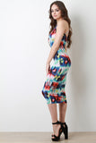 This jersey knit midi dress features a round neckline, sleeveless design, spaghetti shoulder straps to a cross back, stretchy sculpture fit, and tie dye pattern print. Accessories sold separately. Made in U.S.A. 96% Polyester, 4% Spandex.