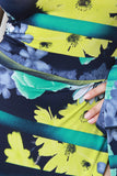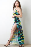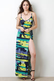 This maxi dress features floral striped print, sleeveless, v-neckline, spaghetti shoulder straps, cinched waist seam, self-tie d�cor, and a high slit side. Accessory sold separately. Made in U.S.A. 92% Polyester, 8% Spandex.